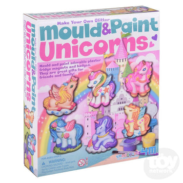 This Mold And Paint - Glitter Unicorns kit has users insert plaster into the unicorn molds, and paint it when dried. Includes plaster, paint, molds, paintbrush, and instructions. Each piece is in a colored box.