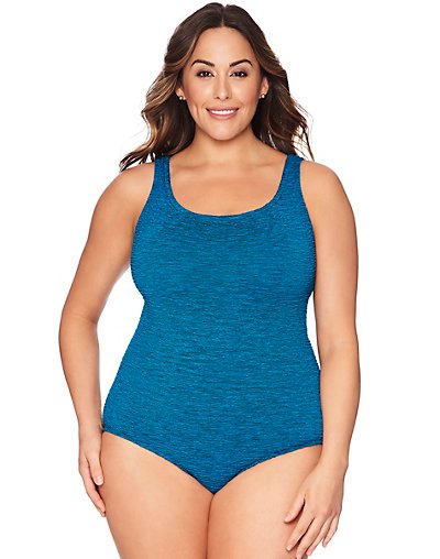Your favorite is back! Get a comfortable swimsuit that goes the distance. for lap swimming, water aerobics, or simply relaxing poolside. Swimsuit resists chlorine, so the rich colors last. Soft crinkle fabric resists fading when it's exposed to chlorine. Sewn-in soft-cup bra adds support. Crossover back allows free-moving ease while keeping straps securely in place. Hidden panel smooths your tummy.