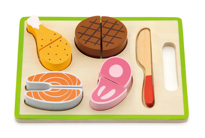 The My Cutting Dinner Set by VIGA Toys brings mealtime fun to playtime! This wooden cutting set includes various dinner foods, a wooden knife, and a cutting tray with cut-out matching shapes to enhance role-playing and matching activities. Designed for imaginative play, this durable and interactive set is perfect for little chefs who love pretend cooking!