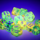 Each set contains 12 Nebula Spring 16mm d6 dice with white pips (DN1655) in 02805 Display Case w/Lid and Foam Square This color has our Luminary™ effect. It can look like stars in the dark (with enough light exposure beforehand or under a black light).