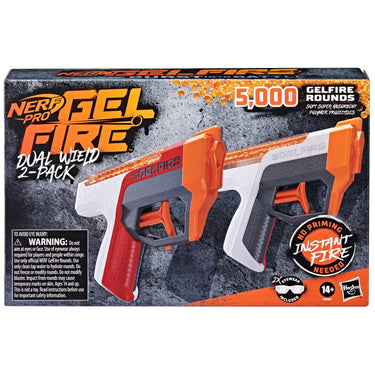 Burst into battle with Nerf Pro Gelfire blasters that deliver high-performance blasting and feature hydrated rounds that burst on impact! Nerf Pro Gelfire rounds come dehydrated in the box, add water to hydrate them. The hydrated rounds fire from the blaster at a high velocity and burst when they hit a target. No need to pick up rounds! The Nerf Pro Gelfire Dual Wield Pack includes 2 blasters that feature instant firing, no priming needed! Simply pull the trigger to fire rounds. You can hold and fire a blaster in each hand for a double-fisted battle advantage in competitive outdoor games. Fire as fast as you can pull the trigger! No batteries needed. Each blaster has a 100-round capacity integrated hopper for easy fill and high capacity. Includes 5,000 dehydrated Nerf Pro Gelfire soft super absorbent polymer projectiles, 2 pairs of protective eyewear, and trigger lock. The quality design provides durability for competitive Gelfire games. Outdoor use recommended. For ages 14 and up.