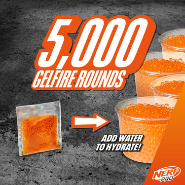 - 5,000 NERF PRO GELFIRE DEHYDRATED ROUNDS: Add water to hydrate the soft super absorbent polymer projectiles. They fire at a high velocity and burst when they hit a target. No pick-up needed