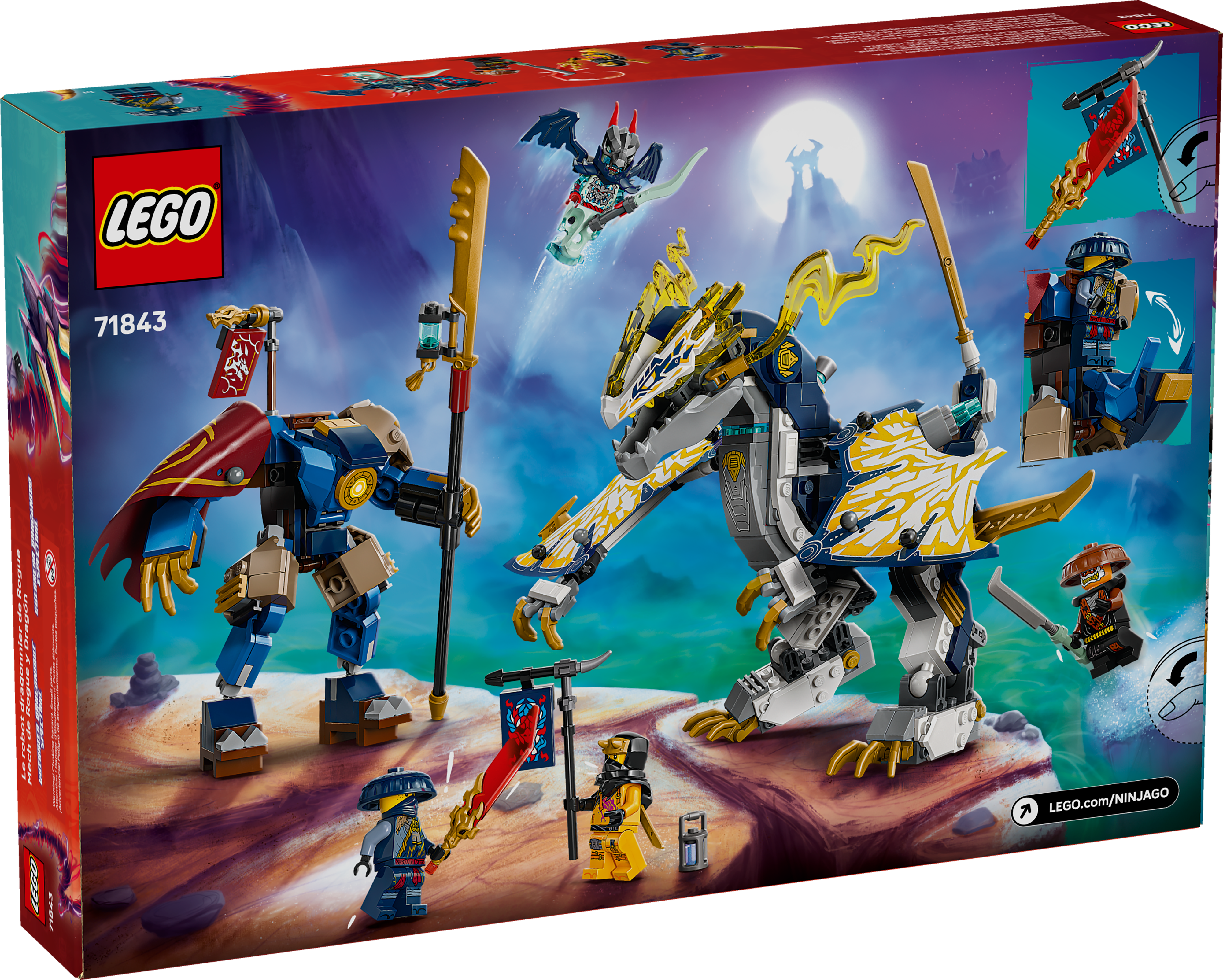 Rogue’s Mech Dragon Rider (71843) combo ninja toy lets boys and girls aged 8 plus enact tales from season 3 of the NINJAGO® Dragons Rising TV show. Kids can separately play with a mech toy and the first-ever NINJAGO robot dragon toy before combining them into the awesome Rogue’s Mech Dragon Rider. The mech toy has movable arms and legs, a chest that opens to place a minifigure inside and a sword, while the dragon figure has movable wings, head, jaw, legs and tail and a sword. There are 4 minifigures: ninja warriors Rogue and Arin, and the villainous duo of Rox and a Spectral Dragonian Warrior who have a banner with a secret message that can only be read using Arin’s reveal blade accessory. Kids can attach the mechs from Kai’s Mech Storm Rider (71830) and Kai’s Mech Rider EVO (71783) playsets (sold separately) to the back of this set’s dragon figure. This playset can be created with the LEGO® Builder app, which guides you and your child on a building adventure. Set contains 584 pieces.