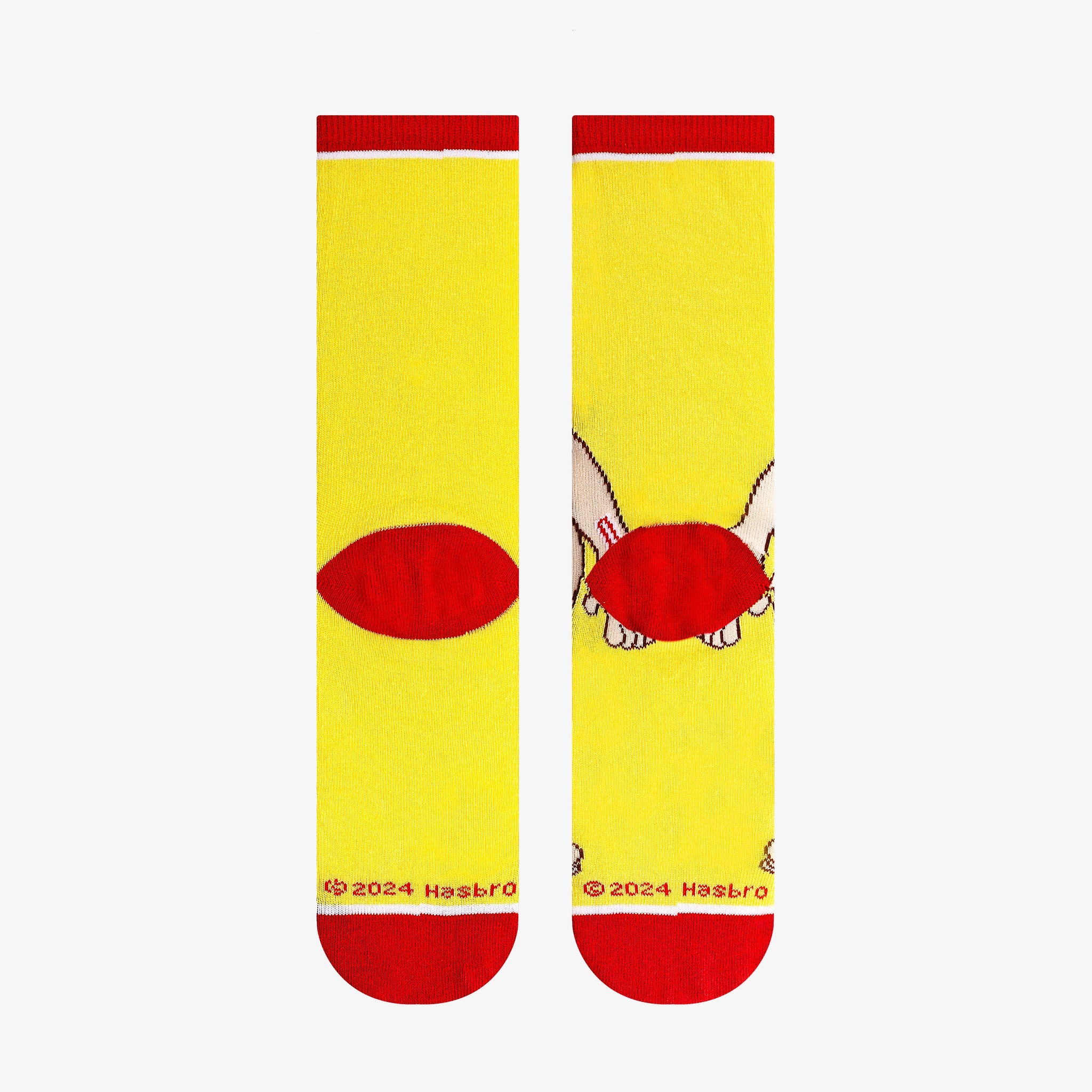 Relive the classic board game fun with these Operation Split Men's Crew Socks! Featuring the instantly recognizable game board character with all his wacky ailments, these crew socks bring playful nostalgia to your wardrobe. With bold yellow, red, and pink colors, they showcase the quirky elements of the Operation game, from the iconic tweezers to the various "ouch" zones. Whether you're a game fan or just love a quirky design, these crew socks are a perfect way to add fun to your outfit. Great for gamers and retro enthusiasts alike!