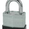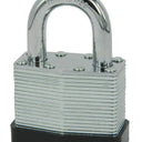 Laminated steel padlock body with a chrome plated, hardened steel shackle. Anti-pick pin tumbler cylinder. Lower bumper to reduce scratching on surfaces while the padlock is in use.