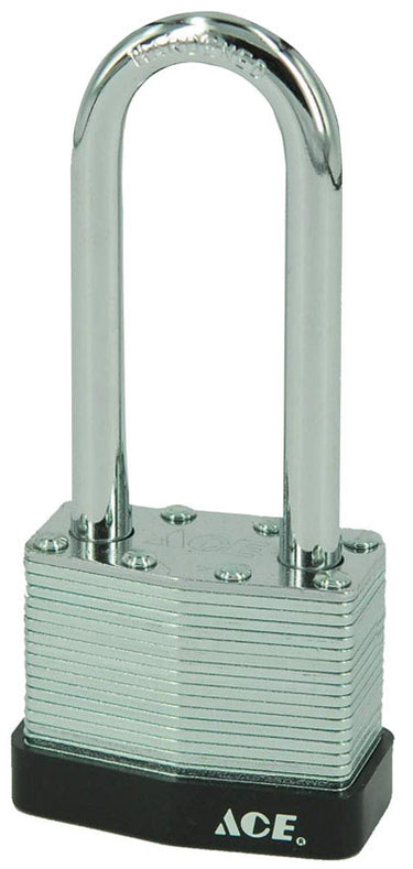 Laminated steel padlock body with 2-1/2" a chrome plated, hardened steel shackle. Anti-pick pin tumbler cylinder. Lower bumper to reduce scratching on surfaces while the padlock is in use.