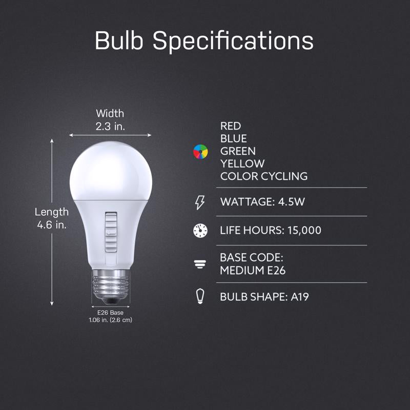 Light up your next party or special event with the Feit Electric A19/RGBY/6WY/LEDI Color Changing LED. This versatile A19 light bulb emits bright color-selectable light. 6 different color modes provide the perfect ambiance for weddings, parties, photoshoots, filming, and outdoor events. An integrated switch makes it easy to change colors. Simply turn the switch to cycle through red, green, blue, yellow, and color-cycling. You can also change colors by toggling a connected wall switch. This long-lasting LED light bulb uses just 4.5 watts of electricity - up to 92.5% less energy than equivalent 60-watt incandescent bulbs. It has an estimated annual cost of only $0.54. The medium E26 base fits standard household sockets. No apps or Wi-Fi are necessary. This bulb is damp location rated for use in bathrooms or covered patios and porches. Get fun, festive light that lasts up to 15,000 hours or 13.7 years with average 3-hour daily use.