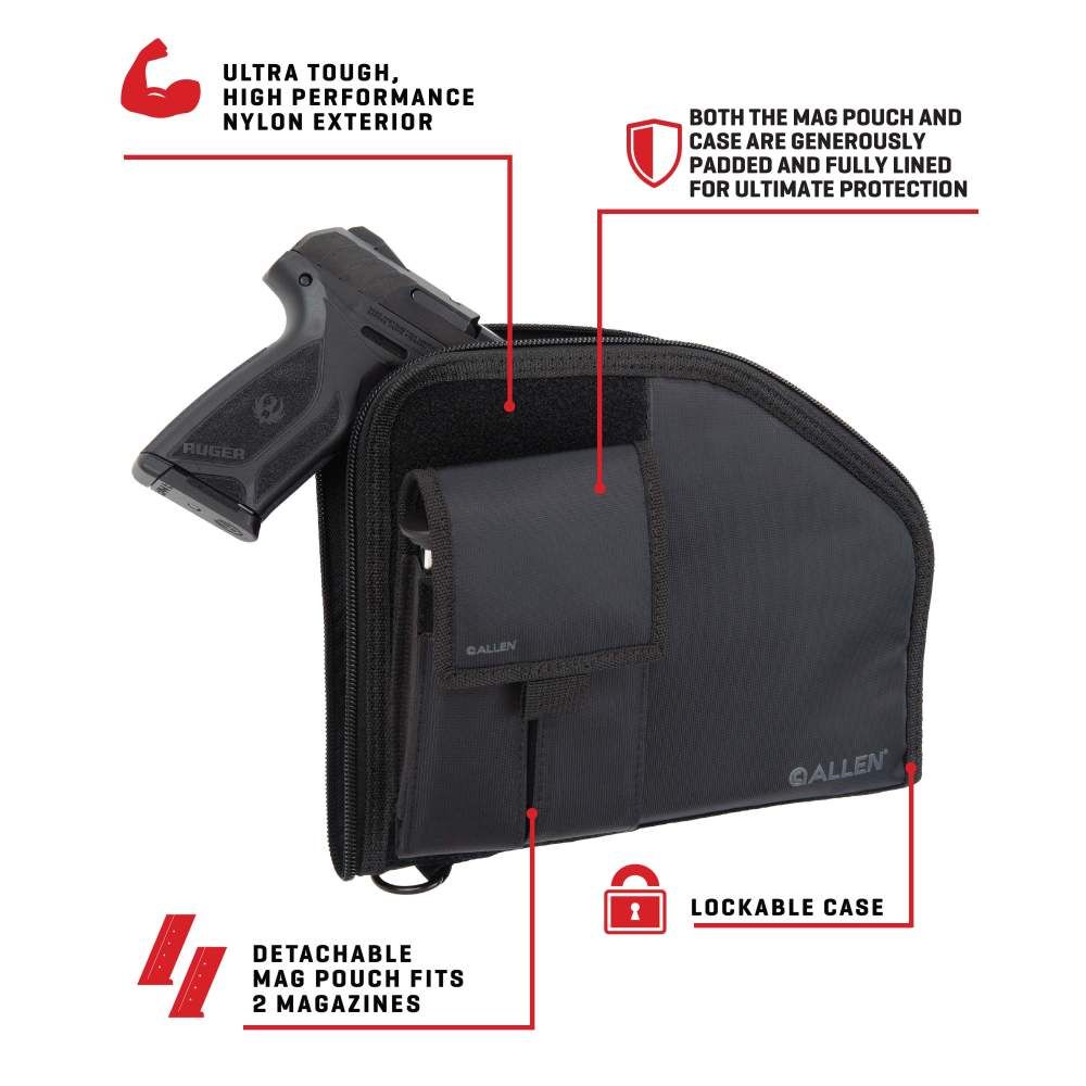 The Allen Company Pistol Case, with mag pouch, provides you with a high-performance, lockable design to keep your handgun protected against the elements or while in transport. Pistol case fits full-size handguns up to 9.5-inches and comes with a detachable mag pouch, fitting up to 2-magazines. High performance, ballistic nylon exterior, with soft brushed interior, helps keep your investment, and mags, safe and secure. Both the case and mag pouches are fully lined and padded for complete protection.