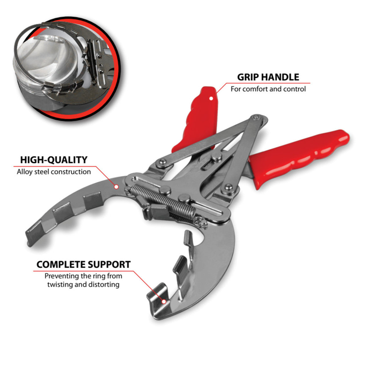Remove and install piston rings with these pliers. Supports around the entire ring to prevent twisting.