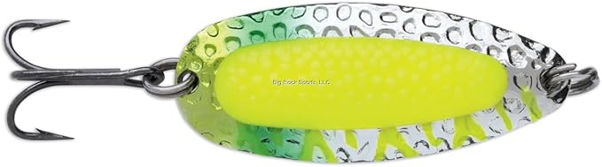 The Pixee Spoon features a heavy construction that allows incredibly long throws and deep retrieves even in fast flowing water. The egg bag insert adds a natural element that drives fish wild. Coated brass with hammered surface reflects more light and increases flash. Finished with high-quality VMC black nickel hooks. Each spoon contains a matching Siwash hook. A "precious metal" in Alaska.