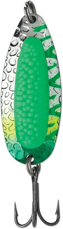 The Pixee Spoon features a heavy construction that allows incredibly long throws and deep retrieves even in fast flowing water. The egg bag insert adds a natural element that drives fish wild. Coated brass with hammered surface reflects more light and increases flash. Finished with high-quality VMC black nickel hooks. Each spoon contains a matching Siwash hook. A "precious metal" in Alaska.