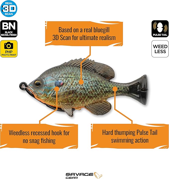 • SAVAGE GEAR BLUEGILL FISHING LURES: Based on 3D scans of a bluegill with an incredibly authentic photoprint pattern, the Pulse Tail Loosebody Bluegill delivers unparalleled realism to attract large fish in pressured waters.