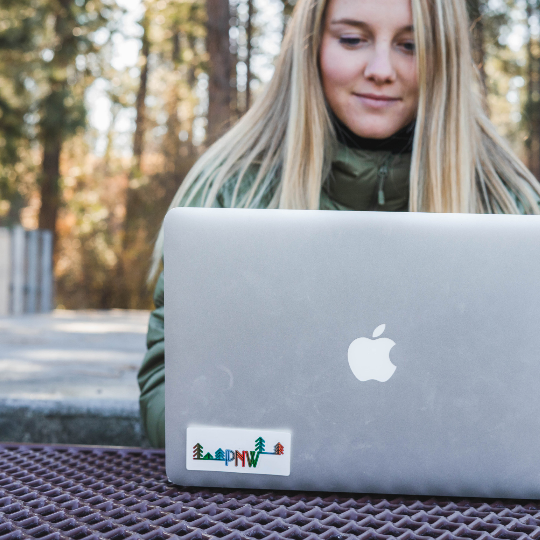 Show your PNW pride with this colorful sticker. A gradient of blue-to-red-to-green fills the line art of this flowing sticker, creating the letters "PNW" connected to trees growing upwards on either side. 3"-by-1"