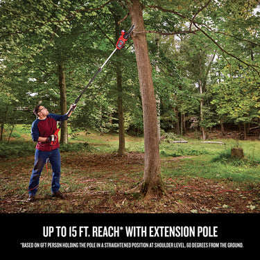 8 amp 2-in-1 corded chainsaw and pole chainsaw features a powerful motor helping the user power through tough cuts. The versatility of this tool allows it to be used as a regular handheld chainsaw and then as a pole chainsaw with the included extension pole giving you up to a 15 ft. reach.