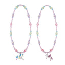 Prance through the grassy forest with this fun necklace available in two styles. Pastel pinks, greens, purples and blues form the chain with fun glitter dusted beads. Each necklace is finished with your choice of a pony or unicorn charm pendant feature more glitter accents.