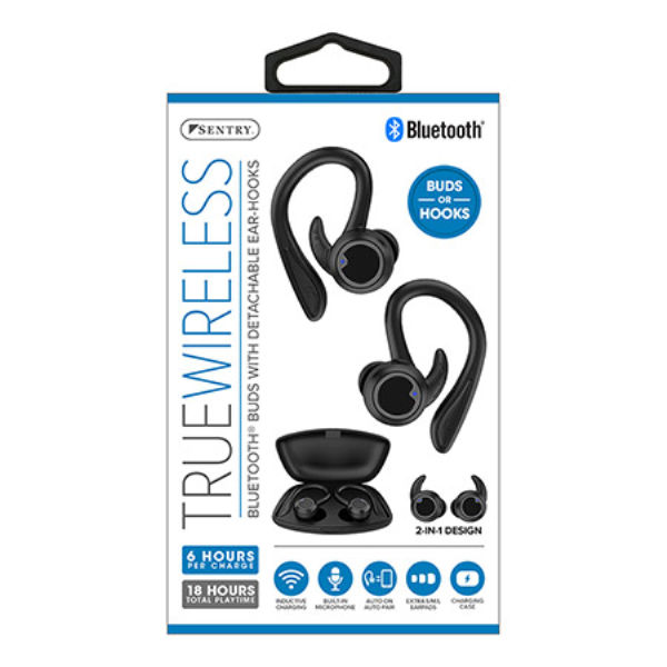 The BT899 (HPXBT899) Bluetooth Earbuds from True Wireless / Sentry feature a detachable ear-hook design for custom comfort. The built-in microphone lets you take and make hands free calls. Wireless in-case induction charging for 18 hours total playtime with 6 hours per charge.