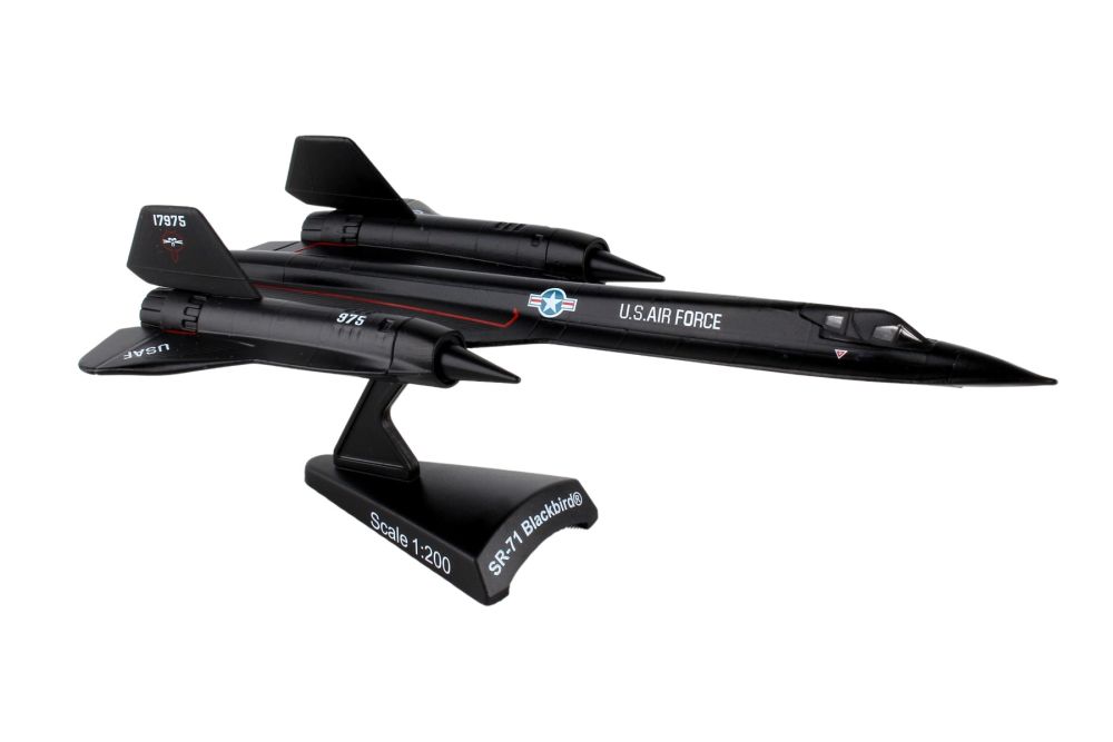 After 30 years in service the Blackbird still looks like a 21st century aircraft. The SR-71's mission was strategic reconnaissance. One of the fastest planes ever built, it reached a top speed of more than 2,200 mph at an altitude of 80,000 feet. At this altitude, the crew needed to wear special pressurized suites and helmets and required 100% oxygen to survive. Because of its unique look and technological achievements, this aircraft is a favorite among aviation enthusiasts. This die-cast metal model comes in 1:200 scale with plastic stand and is approximately 6 3/16 inches long with 3 3/16 inch wingspan. Adult Collectible ages 14+