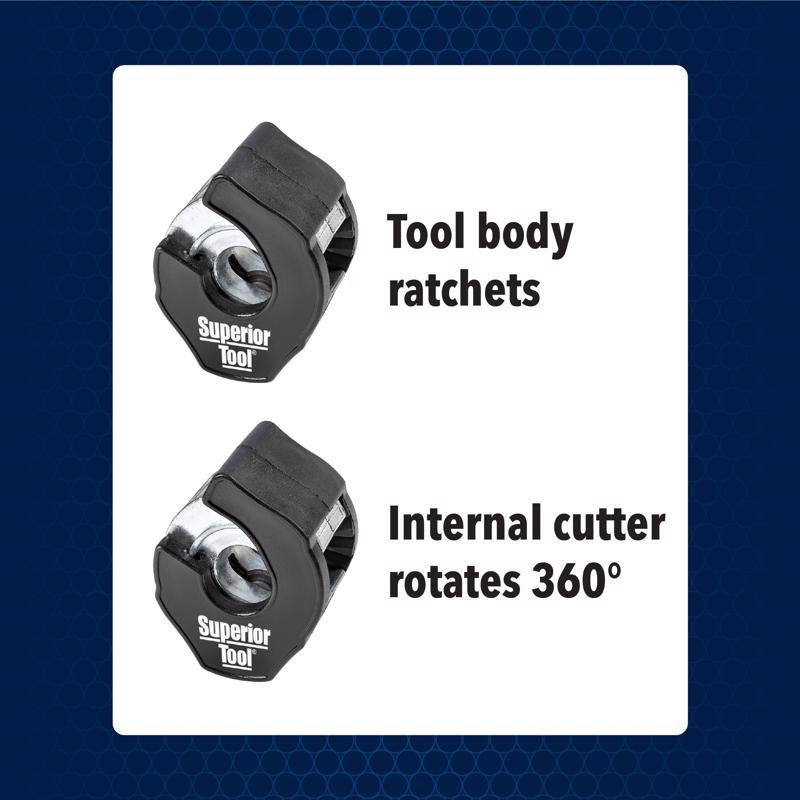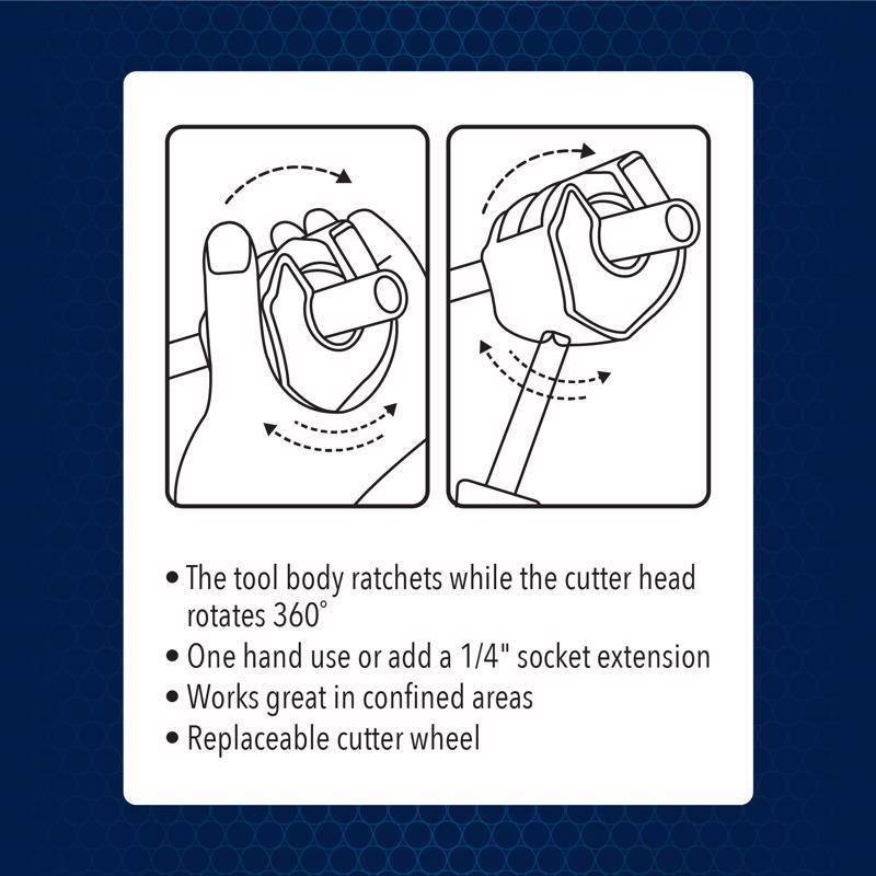 Superior Tools 1/2 inch Ratcheting QuickCut Tubing Cutters game changing design features a ratcheting housing and internal cutter head. Working in a tight space? No problem! The tool body ratchets while the internal cutter head rotates 360 degrees, making this a must have cutter for confined spaces. Superior Tools ratcheting QuickCut cutter can be operated either with one hand or used with a 1/4 inch socket extension to power through a variety of mid-sized tubing materials with ease. Replacement wheel available.