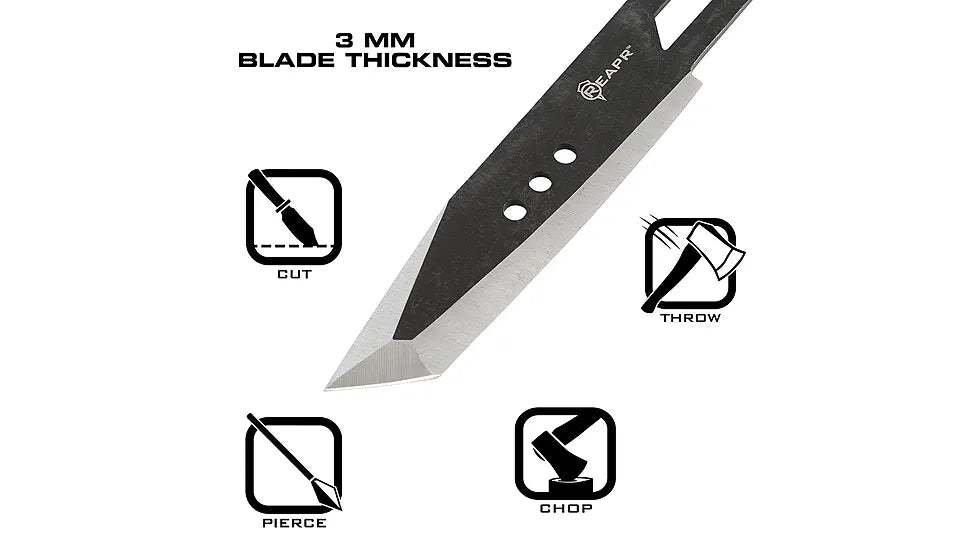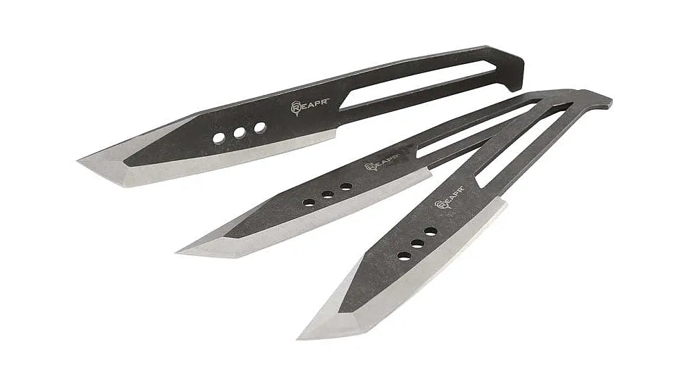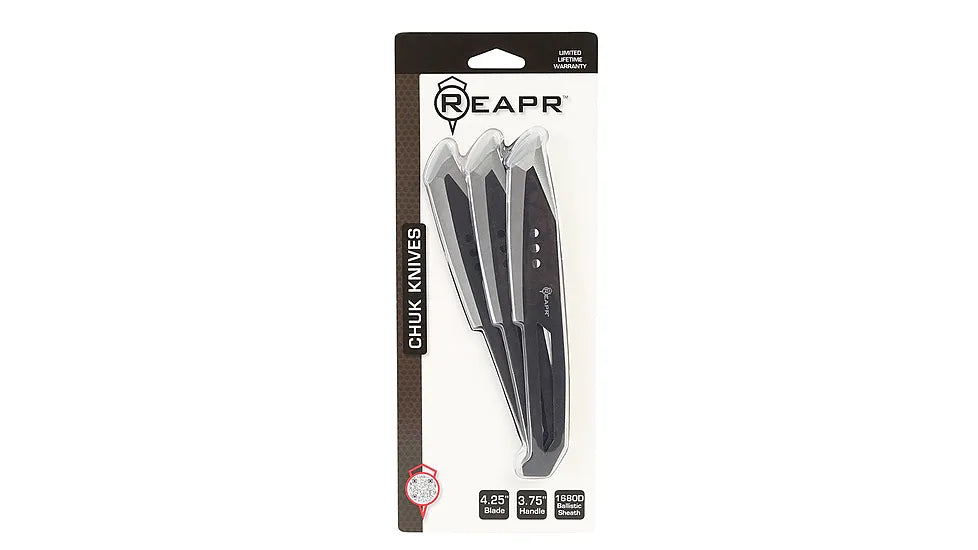 Hit the bullseye every time with these perfectly-balanced throwing knives. The Reapr 3 Piece Chuk Knives set is ideal for camping, parties, barbecues, and other outdoor activities. The 4.25 (108 mm) stonewashed finished blades withstands the elements and are built for throwing accuracy. The Chuk knives are constructed from 420 stainless steel and fit securely into the 1680D ballistic sheath with MOLLE attachment.