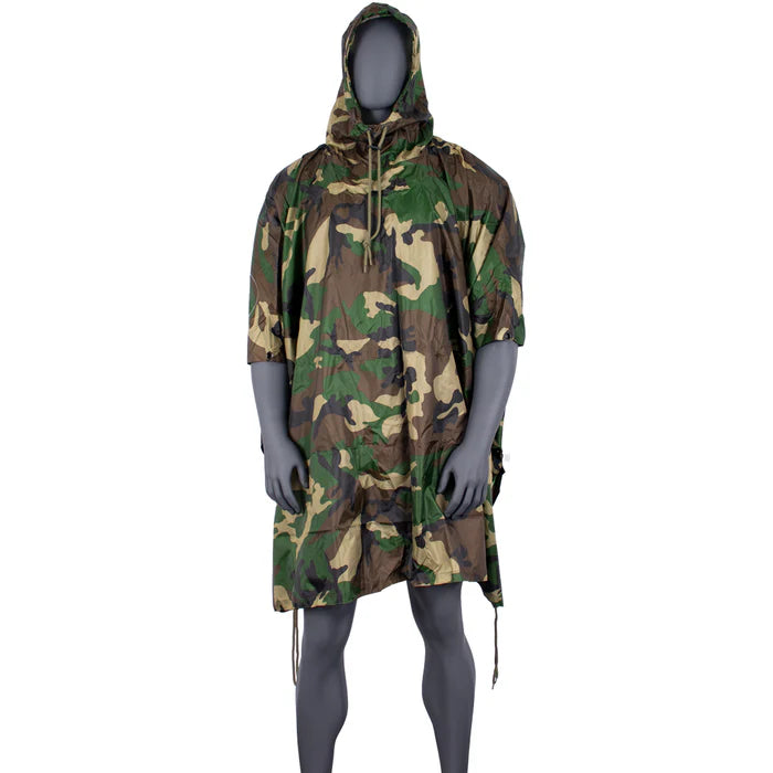 Our Ripstop Poncho is made with 210D Polyester with P/U coated water repellent material and features a built-in hood with drawstring, 8 side snaps, 6 grommets and inside web strips for attaching poncho liners. Comes complete with a drawstring carry pouch.