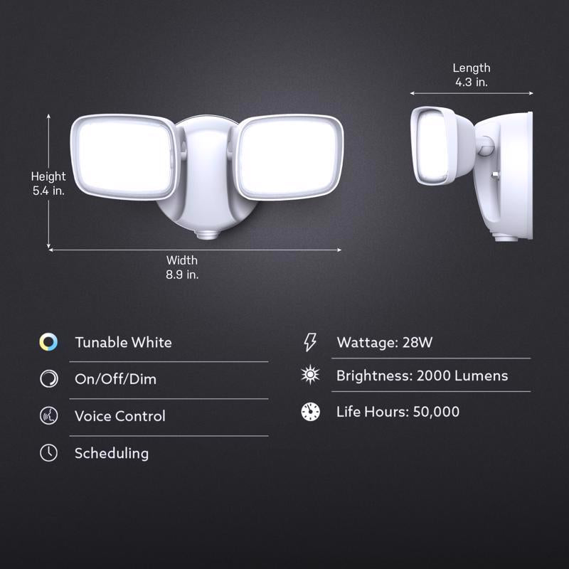 The Feit Electric S9DFL/CCT/WH/AG 28-watt Smart LED Dual Head Flood Light provides added outdoor security lighting to both residential and commercial areas. It comes in a durable white aluminum housing with polycarbonate lenses and two adjustable heads. Super bright 2000-lumen LEDs are integrated into the fixture so there are no bulbs to replace. Its tunable white feature allows you to wind down with relaxing soft white light, get productive with cool white, set energizing daylight, or select a wide range of options in between from 2700K - 6500K. Control the white light color temperature, brightness, and more using your smart device and the Feit Electric mobile app, or add Alexa/Google Home assistants for voice control. Set schedules for automatic on/off or use the dusk to dawn feature to automatically turn on when the sun goes down and turn off at sunrise. Set up is simple: connect directly to your home Wi-Fi using a 2.4GHz network. Get light exactly where you want it with dual heads that are adjustable from side to side and up and down. These outdoor wall lights are weather resistant and can be easily mounted on walls or pole mounted with the included hardware. They deliver welcoming, safe, and reliable exterior lighting for 50,000 hours or more.