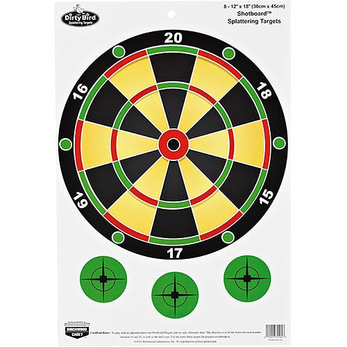 Description: Dirty Bird 12"x18" Shortboard - /b Manufacture ID: 35562 br Fun for all ages! Improve your shooting skills with these colorful Dirty Bird style targets. Each shot will “halo” white so you instantly know where your shot has hit. Use them while shooting alone or appeal to your competitive side and try to beat your shooting partner! Play your favorite dart board games with Shot board & trade. BR br BR br- 12" x 18" Targets. 8 Pack.