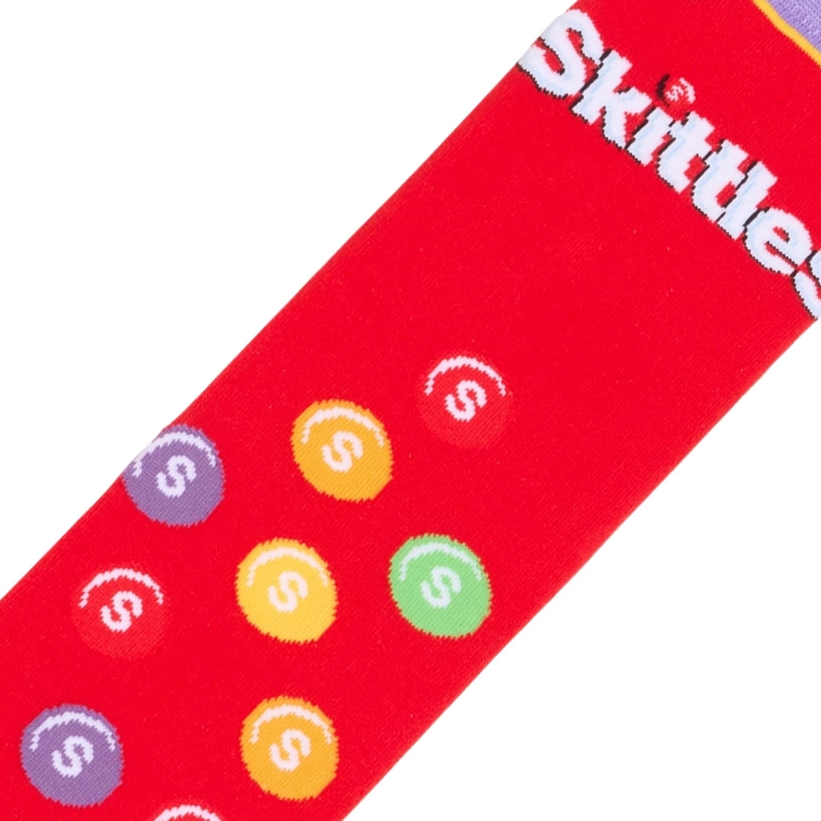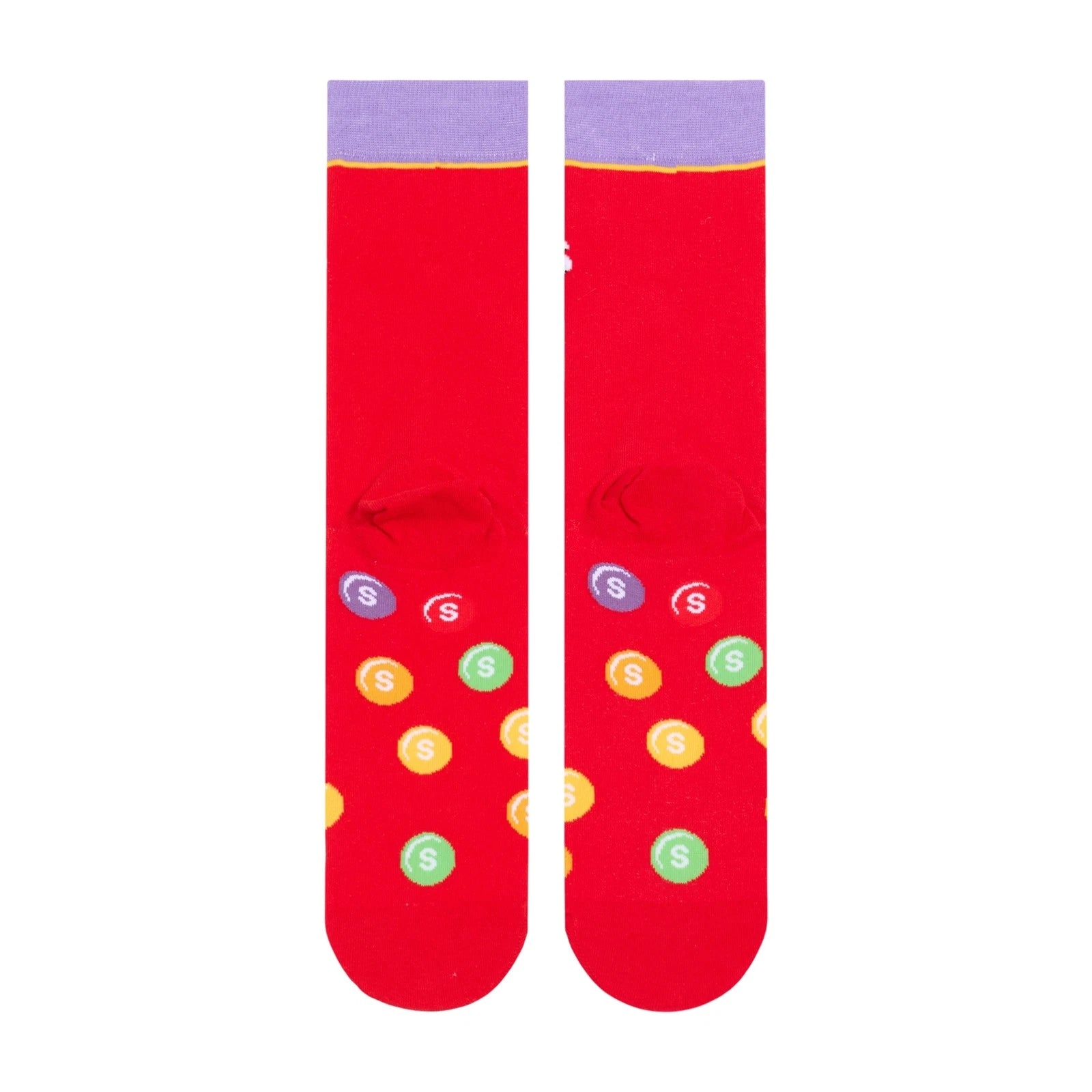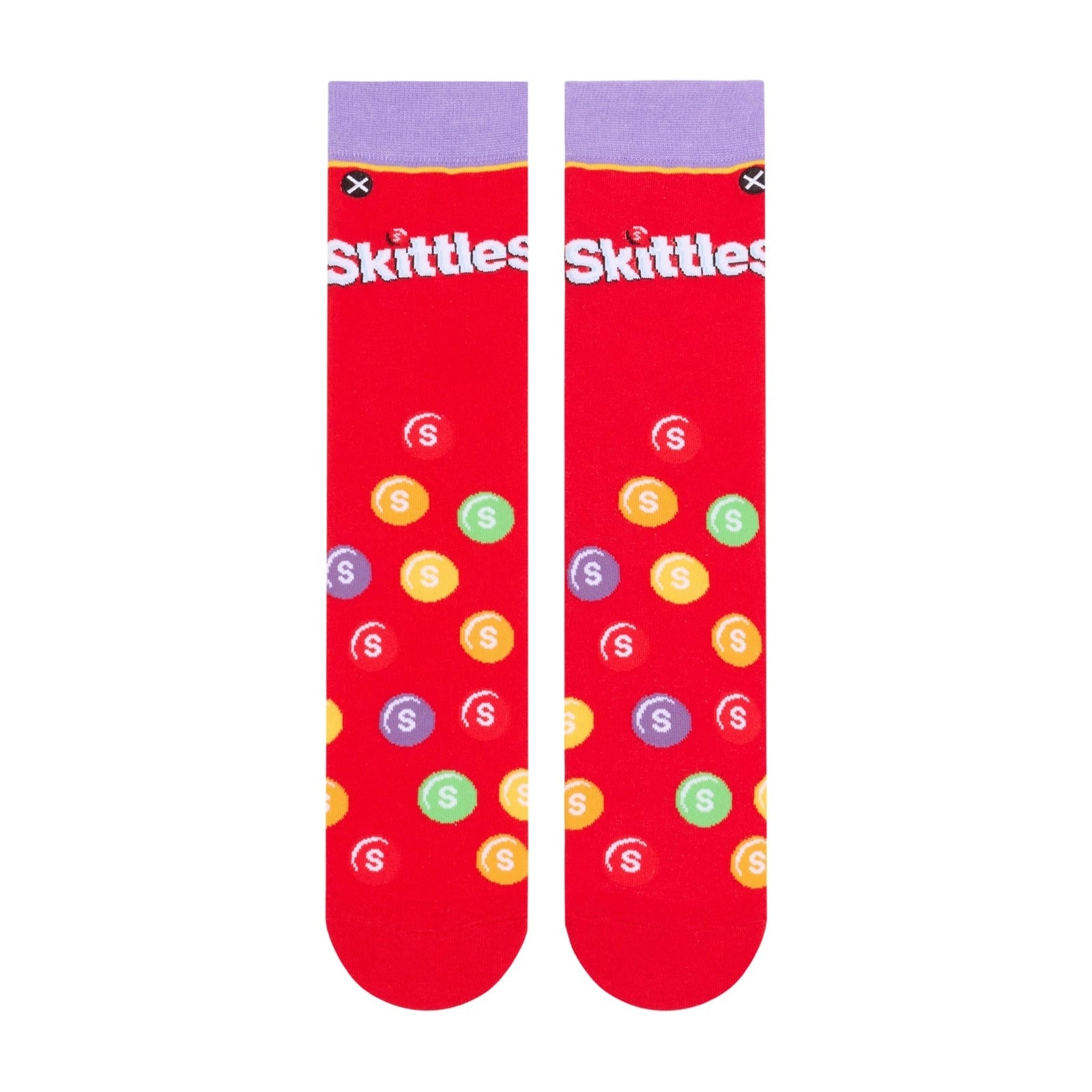 These Skittles Pile Socks are a full-on flavor explosion for your feet. Set on a bold red base, the iconic Skittles logo beams at the top while a cascade of rainbow candies falls below. Topped off with a vibrant purple cuff, these socks are a colorful tribute to tasting the rainbow.