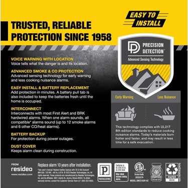 Be alerted to the type of danger and its location in your home with the First Alert SMCO100V-AC Interconnect Hardwire Combination Smoke & Carbon Monoxide Alarm with Battery Backup and Voice & Location Alerts. Easily installed using the quick connect plug. Plus interconnect compatible alarms to create a whole home alarm system to help provide an early warning. Also, the alarm is also equipped with First Alert's Precision Detection advanced sensing technology and meets new industry standards.
