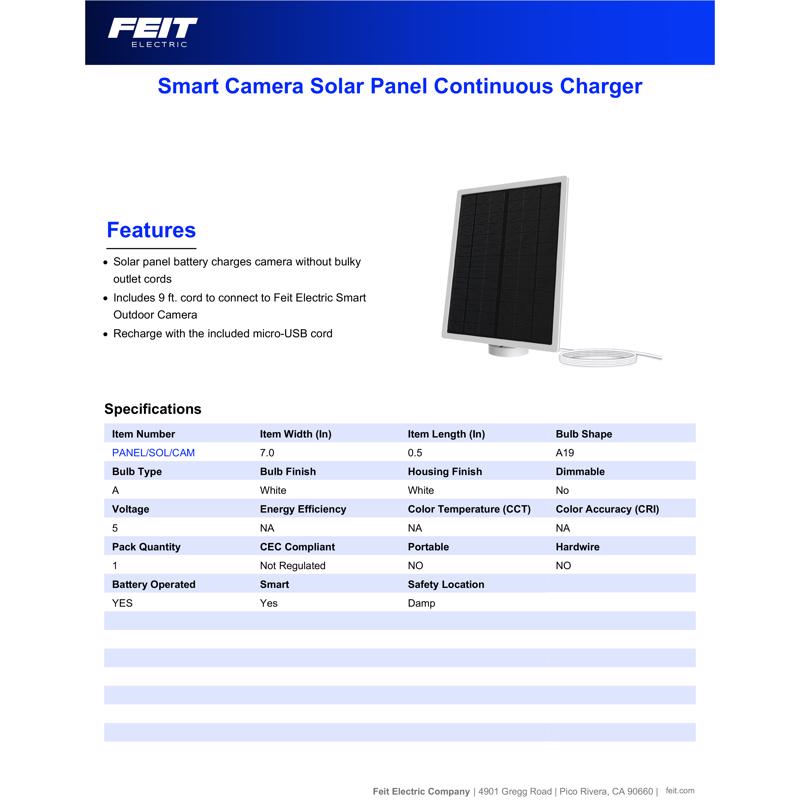 This solar panel accessory connects to the Feit Electric outdoor smart camera and charges the battery without the need for plugging into an outlet. The Feit Electric is a solar panel charger that connects to your Feit Electric outdoor camera keeping it continuously charged. This panel comes complete with a 9 ft. Micro USB Cable and adjustable mounting bracket to easily position the solar panel for optimal sun exposure. The enclosure is designed to withstand rough weather conditions and is water-resistant with operating temperatures of -4 degrees Fahrenheit to 122 degrees.