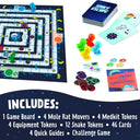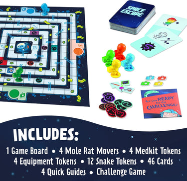 In a space station far from Earth, a team of Mole Rats is busy at work when a band of snakes infiltrates their station. Players work together to help the Mole Rats gather their equipment and make it to their escape pod before time runs out! Climb the ladders, slip down air-shafts, but don't get bitten by the snakes.INCLUDES: 1 game board, 51 cards, 20 tokens, 4 plastic mole rat movers, challenge game and instructions.