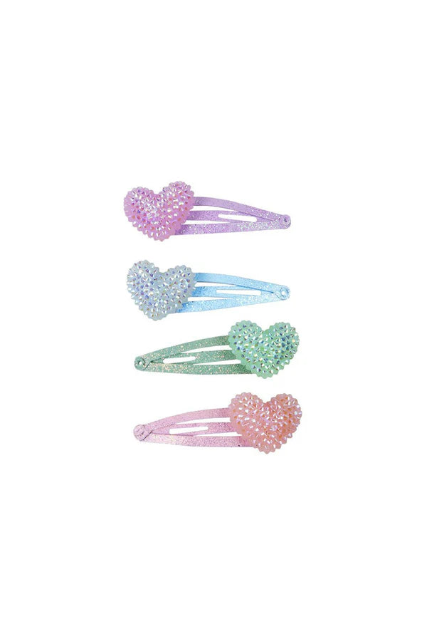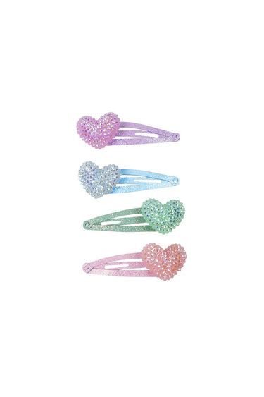 Add some heart and sparkle to your hair style with this set of bedazzled heart hairclips. Perfect to mix and match, this set of 4, glitter matched enamel clips, come in shades of pink, purple, mint and blue.