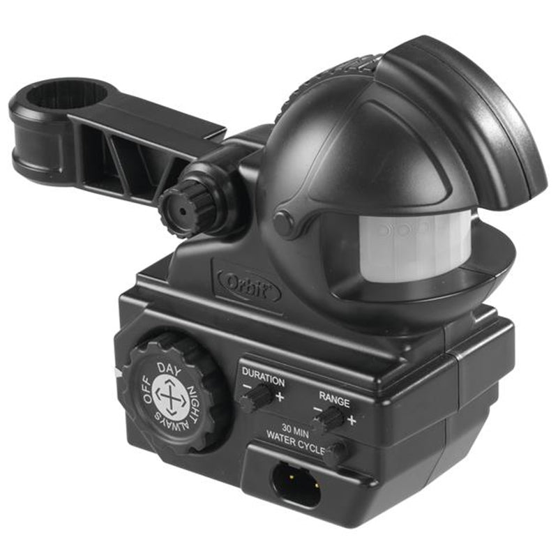 You've created the lawn of your dreams; now protect it with the Orbit Yard Enforcer Motion-Activated Sprinkler. The motion detector sprinkler will protect your trees, plants, flowerbed and veggie garden from uninvited guests such as deer, rabbits, squirrels, mice, rats, birds, cats and dogs. A motion-activated sprinkler is the most humane wildlife deterrent on the market and can be safely used even if your unwelcome guest is a protected species. Determine if you want the motion sensor sprinkler to run only at night when visitors are more likely to appear in your yard, during daytime only or be on constant guard. A strong burst of water will startle but not harm wildlife and is a safe method to shoo them away. Humanely repels animals and pests keeps animals and pests out of plants, yards and gardens using a harmless spray of water. Fully Adjustable spray and distance patterns allow you to reach from 10 feet up to 70 feet, with a radius of a few degrees to a full 360 degrees. Adjustable motion sensor detects movement in areas as large as 3,840 sq.ft. with a 120-degree viewing range and up to 40 ft. of detection area. A solid steel spike keeps the unit firmly planted in the ground to prevent toppling, damage and destruction by animals or people.