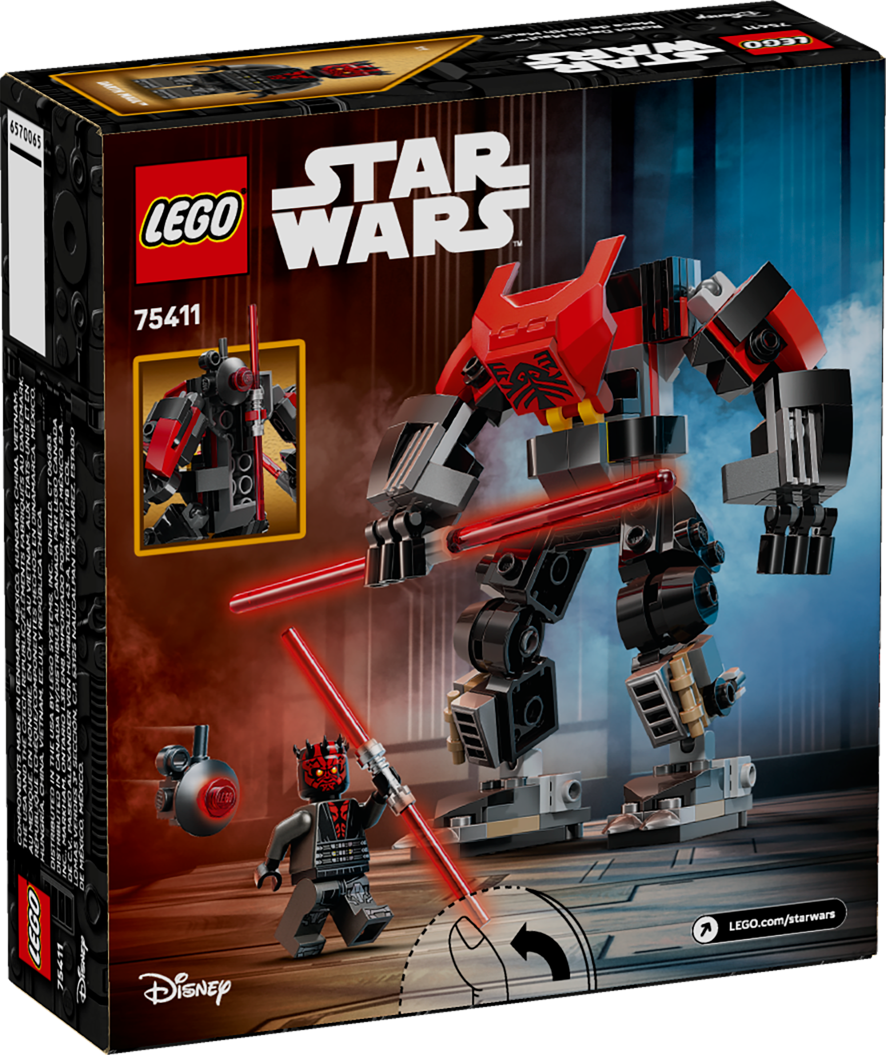 • Darth Maul LEGO® Star Wars™ minifigure – The LEGO minifigure of this iconic Star Wars character comes with a double-bladed red Lightsaber™ that can be clipped to the back of the mech