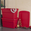 'Tis the season to keep your Holiday decor organized with Sterilite's 30 Gallon Tote. This popular larger size tote is the ideal storage solution for lightweight ornamental decor, outdoor holiday items, and bulky seasonal decorations. The festive red color allows holiday items to be stored away out of sight, yet easy to locate and retrieve when it's time to decorate. The lid snaps tightly to the base, keeping contents contained and concealed. The in-molded handles provide a grip for lifting and carrying, making transporting the tote easier, whether moving your decorations into or out of your storage areas. The indexed surface of the lid allows multiple totes to stack neatly on top of each other for efficient use of vertical storage space. When storing items away, use good judgment and don’t overload them or stack them too high; be mindful of the weight in each box and place the heaviest box on the bottom. Stay neat and organized during the holidays with Sterilite Totes. The overall assembled dimensions of this item are 30 1/2 in. L x 20 1/4 in. W x 17 1/8 in. H.