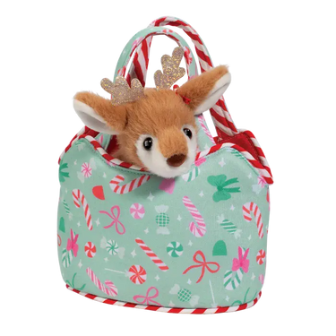The bag design features a festive assortment of peppermint sticks, candies, gumdrops and bows, with a peppermint stick trim and red interior. Peeking out at you from the bag is an adorable little reindeer plush! Her sparkly antlers, ultra soft plush materials, and big friendly eyes will be sure to capture the heart and imagination of anyone who finds her under the tree this year!