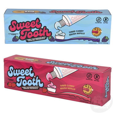 This Sweet Tooth candy takes a sour gel toothpaste and candied toothbrush head for a fun snack. Comes with a whistle.