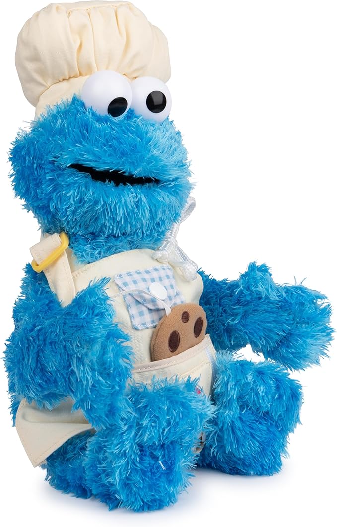 - TEACH ME COOKIE MONSTER: This 15” plush features Cookie Monster dressed as a chef, with a sensory-stimulating apron and features that teach kids dressing skills: a buckle, button, tie cord, zipper, snap button, and a removable chocolate chip cookie