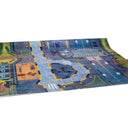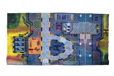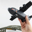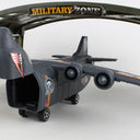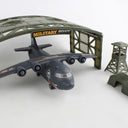 This Military base playset is made of plastic and contains, building, playmat Airplane, 2 Jet fighters, Helicopter, Tank, and 4 military vehicles. Plane is about 9 inches long with 10 1/2 inch wingspan. Playmat once setup 31 inches x 22 inches. Ages 3+