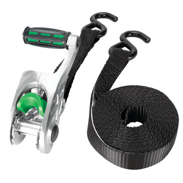 Secure heavy loads with these 14-foot tie-down straps, featuring a ratcheting mechanism and vinyl-coated steel hooks.