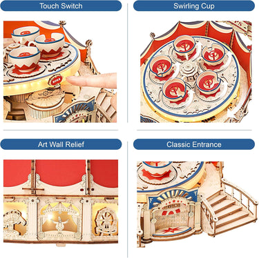• √MECHANICAL FEATURES: Like its name this model kit will tilt and swirl when turned on. Meanwhile the little cups will rotates to the melody at a different speed. Isn't this lovely to watch? You can only keep lightening or music by touching switch. It needs 3 pieces of AAA batteries (not included).