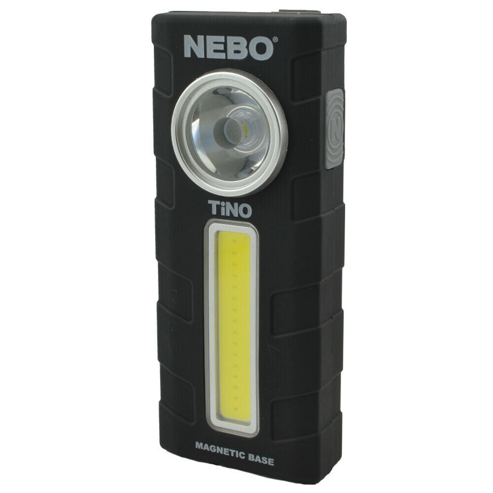 Description: NEBO TiNo is a Premium Multi-Purpose LED Flashlight.The 300 Lumen front facing LED spot light, and the COB LED front facing work light provides you with more than enough power to handle any lighting task that you throw at it.Premium Multipurpose Pocket LightSleek and Compact DesignHands Free UseStrong Magnetic Base3x AAA Batteries (INCLUDED)2 Working Modes with a Dimming Feature.