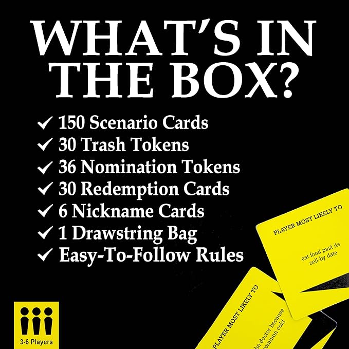 - Set contains: 150 scenario cards, 30 trash tokens, 36 nomination. Tokens, 30 redemption cards, 6 nickname cards, a drawstring bag & instructions.