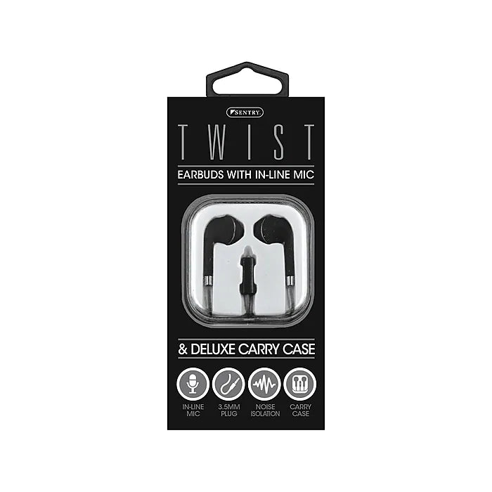 Sentry Twist Earbuds Inline Mic 3.5mm Aux Connector and Carrying Case