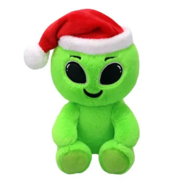 Comet is a bright green alien Beanie Boo with embroidered black eyes and an embroidered mouth with black eyebrows. He wears a red Santa hat with a white trim, topped with a white pom pom.