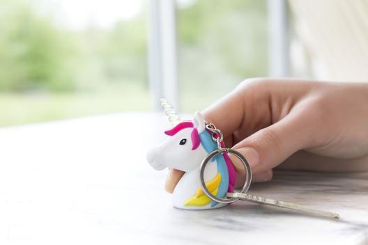 Mythical? Not any more. This Unicorn keychain has a rainbow LED horn and emits a magical sound at the push of a button.