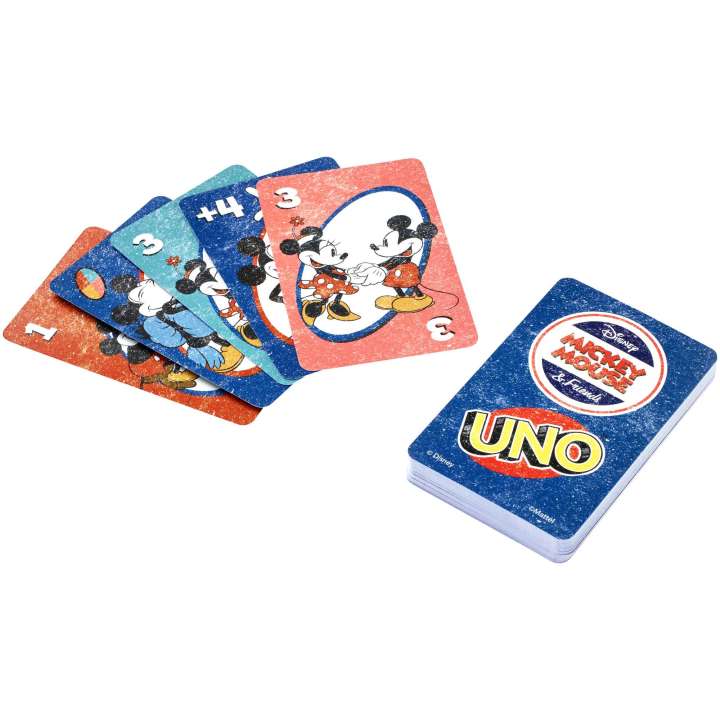 • Each UNO® Disney Mickey Mouse & Friends card features beloved classic Disney characters, like Mickey Mouse and Minnie Mouse.