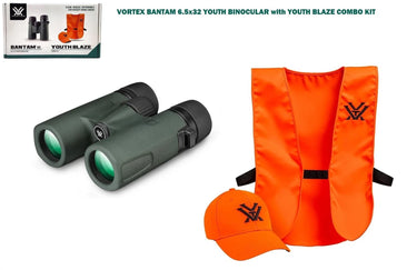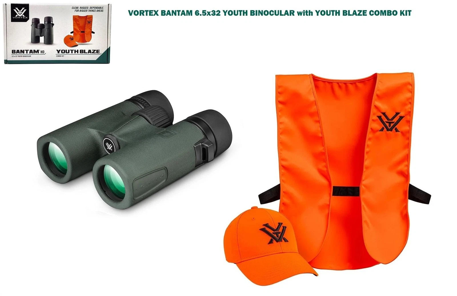The Vortex Bantam HD 6.5x32mm Youth Binocular and Youth Blaze Combo Kit is Perfect For Young Outdoor Enthusiasts. Kickstart your young hunter's outdoor journey with this exclusive kit - a perfect pairing of quality optics and essential high-visibility gear that's made to last.