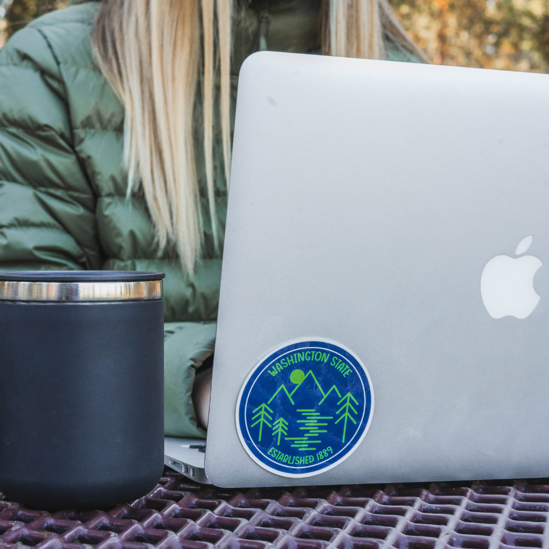 Let your love for Washington State show with this sticker. Green line art portraying mountains, trees, and water stands out against the navy blue background. "WASHINGTON STATE ESTABLISHED 1889" reads along the bottom and top edges. 3" radially (diameter)