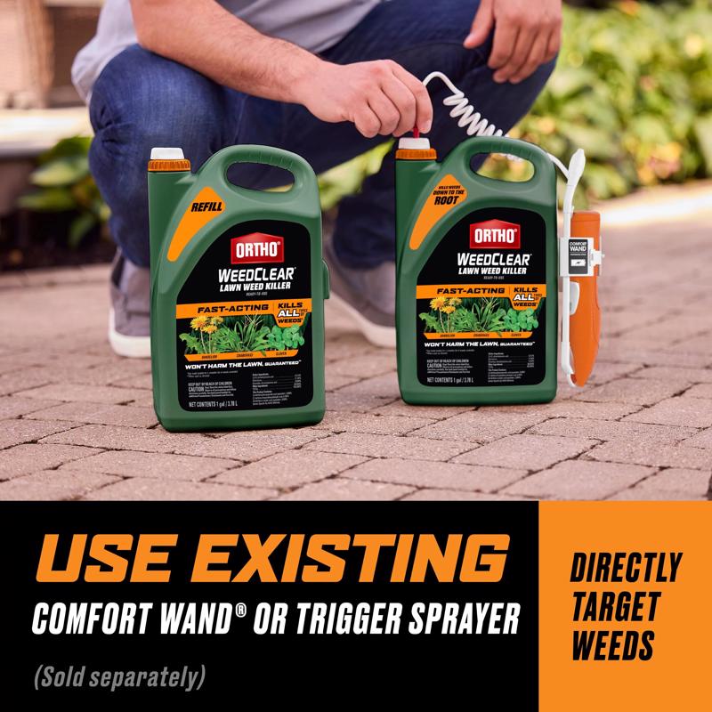 - Just attach the battery-powered Ortho Comfort Wand from your previous bottle to your new refill bottle to spot treat weeds with a continuous stream - no bending or pumping required and 1 gal. bottle treats up to 5,000 sq. ft.