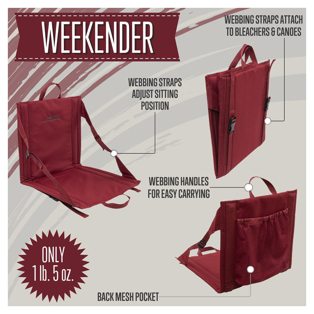 Tired of sitting at sporting events on cold bleachers with a sore back because you can't lean back? The Weekender is a great solution to this problem, and at only 21 ounces, can be brought almost anywhere. The .5" closed cell foam provides protection from the cold hard bleachers and the bottom webbing straps are designed to wrap around bleachers or canoe seats to keep you in place. The Weekender also works great if the ground is the only option, keeping you from having to sit directly in the dirt. The foam gives added comfort and there is a large mesh pocket on the back of the seat to hold snacks, cameras, and any other small gadgets you want to keep with you while you're out and about.